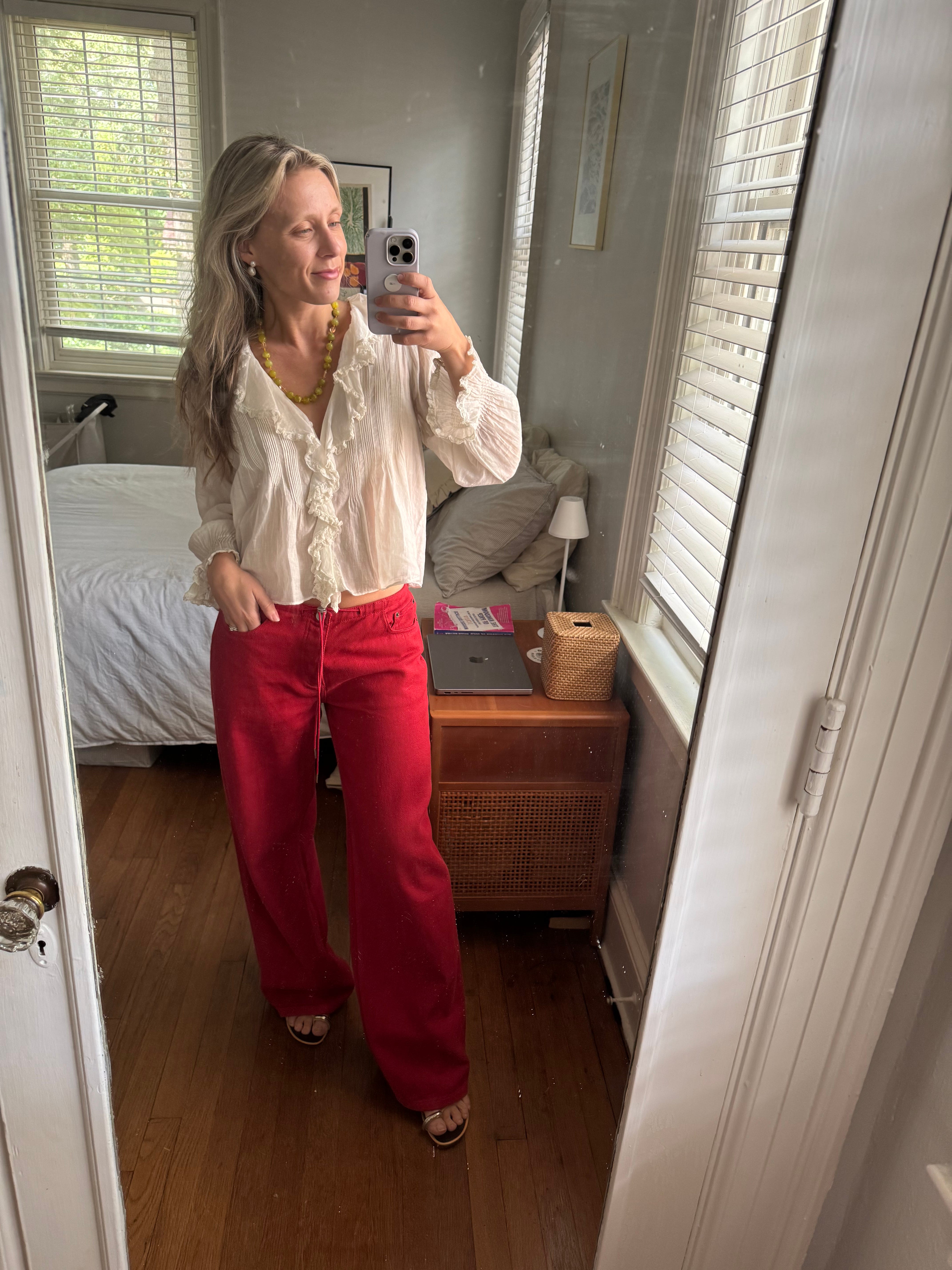 I have been very intentionally practicing what I’m preaching for the past couple of weeks and I’ve been having a lot more fun with my wardrobe than I usually do in August. For starters, it’s time to figure out what accent colors you like the best with your day to day wardrobe- for me I love throwing in a bright red, a soft yellow, or a bright blue for great contrast and because it still feels summery. I pull these colors in via my jewelry, scarves, button down shirts, and light weight knits. Ta-da a third piece that adds more depth to your look and a nod of color that feels intentional and makes you look more put together. Now you may look like you know what your doing (something I would like for all of my outfits to amplify)