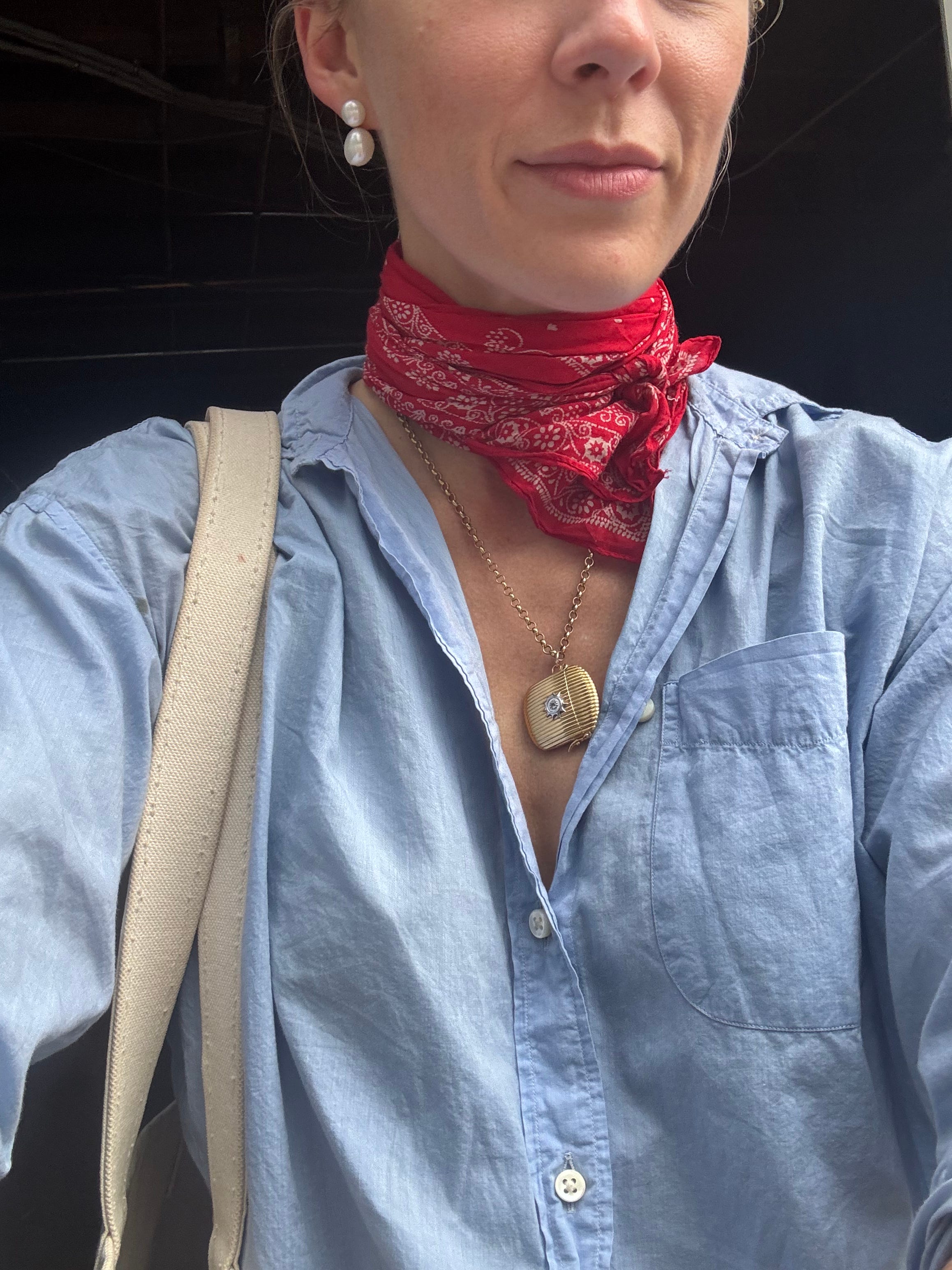 I also want to note that adding a third piece does not only apply to colorful or maximalist dressers. The minimalist third piece is even more important because it means your outfit is already more paired down with nothing to hide behind. A simple third piece can go along way in minimalist styling. This past weekend for my husbands birthday, we went out for a casual dinner and I didn’t want to change out my white tee so I threw together something super simple. I just added a silk scarf and a really simple necklace that added a little pop of blue and boom I have a proper outfit!